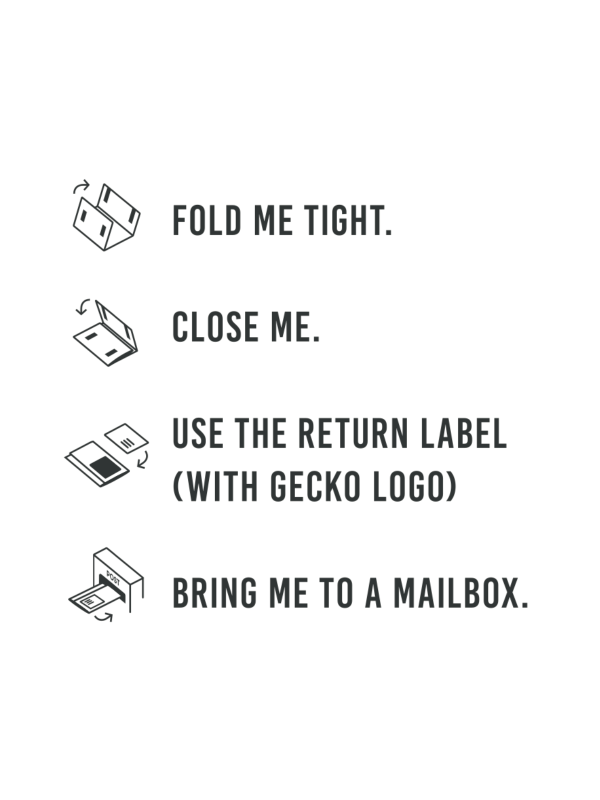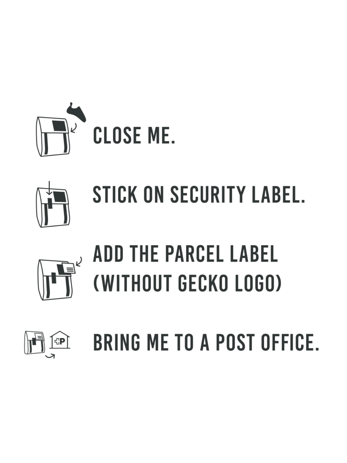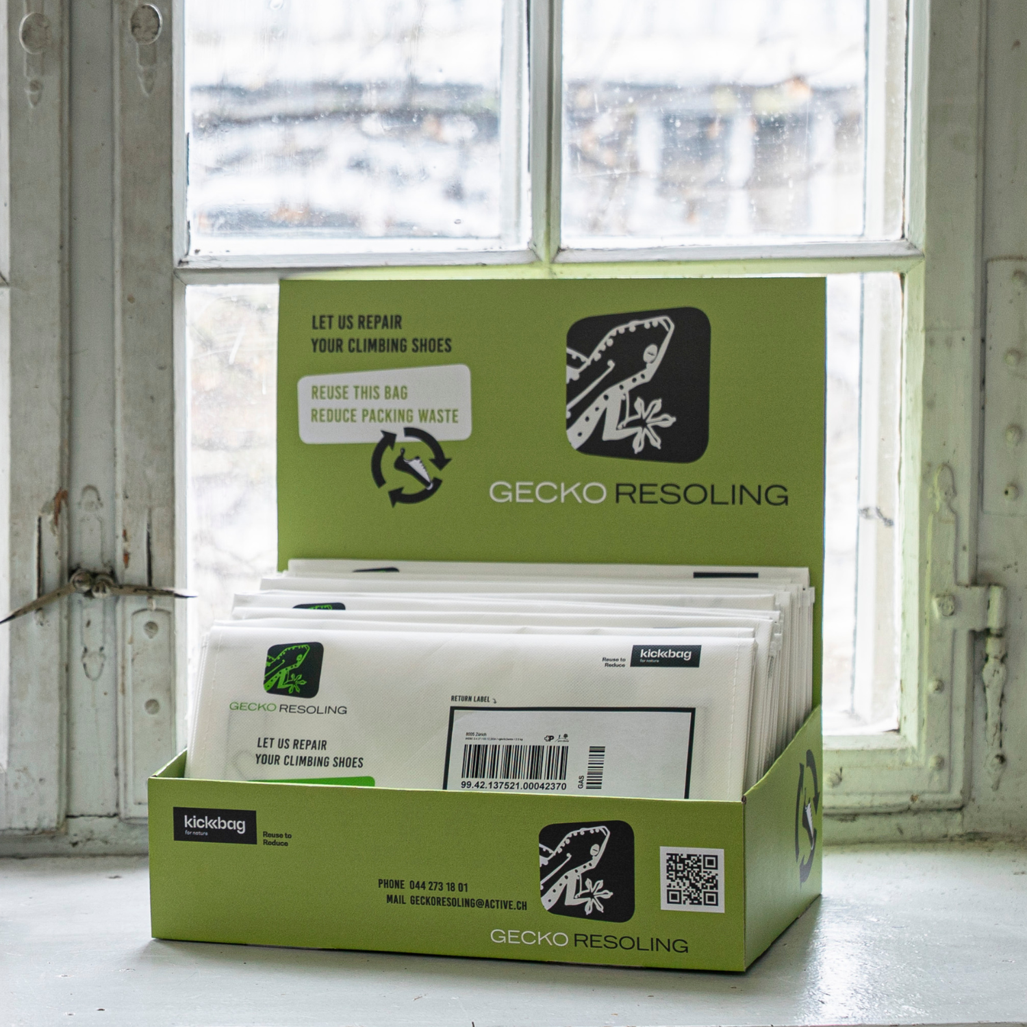 Dann schick uns bitte den leeren Resoling-Bag mit beigelegter Brief-Etikette (mit Gecko Logo) kostenlos via Briefpost zurück.